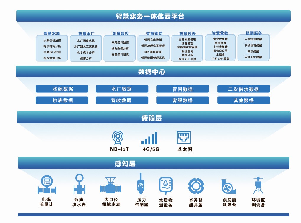 面對城鄉供水一體化的多重挑戰,智慧水務系統提供了一種系統性解決方案。這種以物聯網技術為核心的管理體系,通過分層架構設計,實現從水源到用戶的全流程智能化管控。智慧水務系統的架構可分為四個關鍵層次:感知層、通信層、數據層和應用層。感知層部署在水務系統的關鍵節點,包括電磁流量計、壓力傳感器等設備,負責實時采集供水系統的運行數據。這些設備如同水務系統的“神經末梢”,時刻監測管網壓力、流量和水質參數。通信層則構建了數據傳輸的“高速公路”,采用以光纖為主、4G/Wi-Fi/專網為輔的混合通信網絡。這種設計既保障了核心區域的高速穩定傳輸,又兼顧了邊遠地區的覆蓋需求,實現了城鄉全域的數據聯通。數據層是智慧水務的“大腦中樞”,構建了多源數據融合中心,包含空間數據庫、實時數據庫和業務數據庫。通過ETL工具對數據進行清洗轉換,消除“數據孤島”,生成統一的數據模型,為上層應用提供標準化數據支持。應用層直接面向水務管理者和用戶,設立綜合智慧調度、設施全周期管理和公共服務平臺。這些平臺涵蓋管網監測、水質監控等核心模塊,通過調度大屏、運維APP和小程序等多終端,為不同角色提供定制化服務。