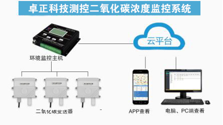 室內二氧化碳變送器起到實時監測的目的,它將數據傳送環境監控主機,通過小主機將數據上傳至云平臺,用戶通過登錄卓正科技云平臺查看辦公室內的二氧化碳濃度變化。